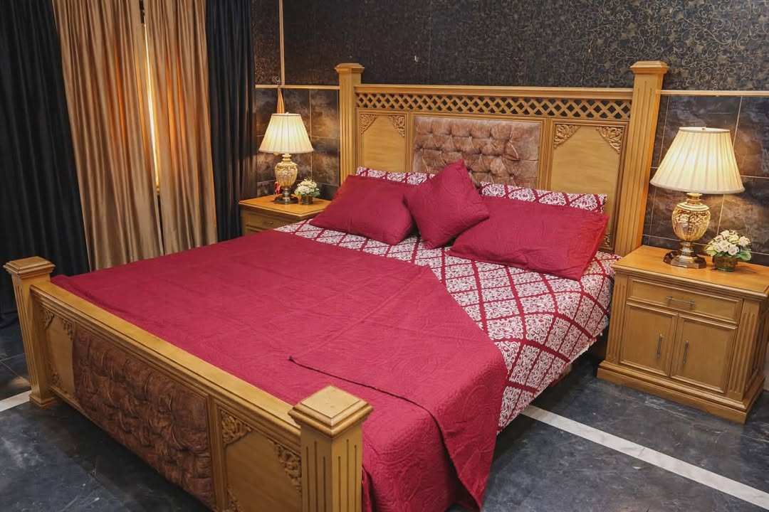 The comforter set features a rich maroon quilted comforter paired with a white and maroon geometric printed bedsheet. It includes matching quilted pillowcases and a cushion cover that add depth and texture. The deep color and detailed stitching give the bedroom a royal, elegant feel that complements classic wooden furniture.