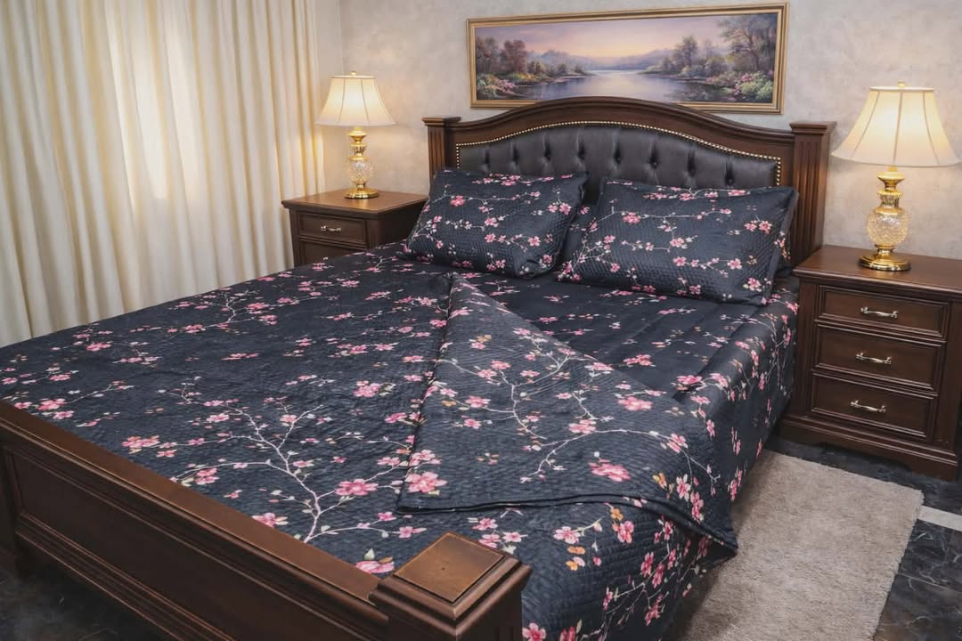 Black quilted bedsheet featuring delicate pink floral branches, paired with matching pillow covers for a soft, elegant look. The subtle textured pattern adds depth and comfort, making it perfect for a cozy yet stylish bedroom setting.