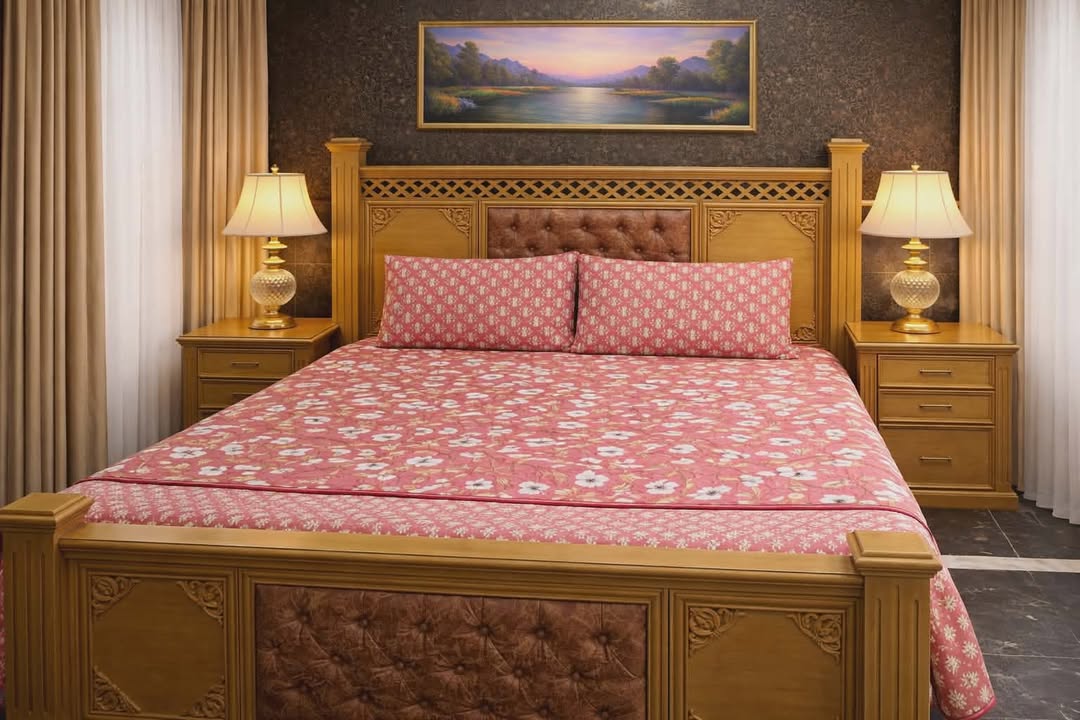 The bedsheet set showcases a cheerful coral pink base covered in a white floral print with soft golden leaves. It includes a matching floral border and two pillowcases in a smaller motif. The warm, vibrant color and quilted texture add a cozy, romantic charm that works beautifully with traditional wooden furniture.