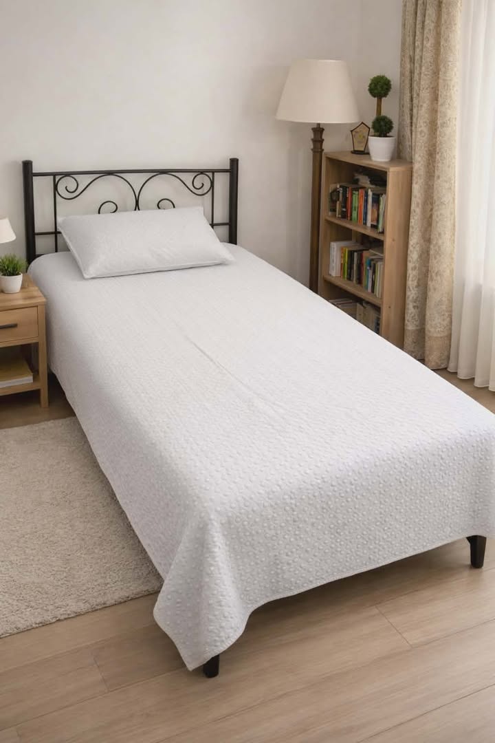 The white single bedsheet is a textured, dot‑patterned quilted cover that drapes smoothly over the mattress and matches with a coordinating pillowcase. It gives the bed a clean, minimalist look and adds a soft, cozy feel to the bedroom setup.
